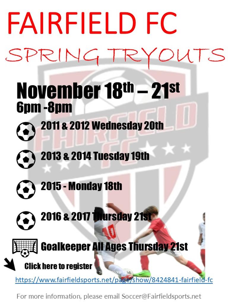 This link will bring you to the registration for Fairfield FC Spring 2025 tryouts only. There will be a separate registration for the players who are selected to play on the FFC Teams.